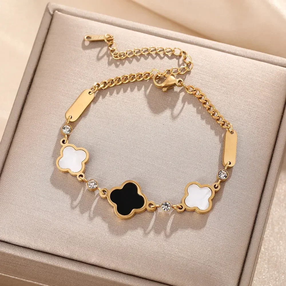 8k Gold Stainless Steel Korean Diamond Four Leaf Grass Women Fashion Jewelry Bracelet